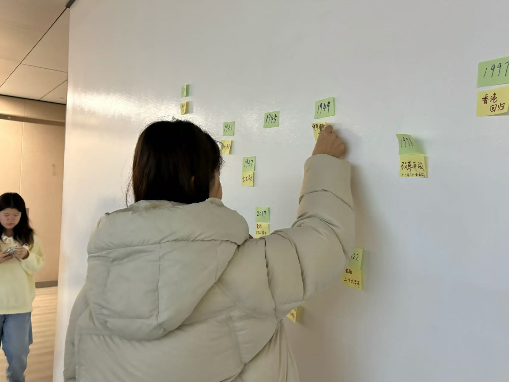 活动伊始,主持人首先介绍了本次主题团日活动的内容、流程及目标。活动以“世界青年节历史时间线”为主题,通过学生将历史节点贴纸贴于时间线上的方式,达到 学生深入理解世界青年节历史意义的目标。随着互动环节开始,同学们积极登台,手持历史节点贴纸,精准地粘贴于相应位置,亲手串联起节日从诞生到发展的完整脉络。每一个落点,不仅展现出同学们对历史脉络的清晰认知,更让青年与时代同频共振的轨迹愈发鲜明。