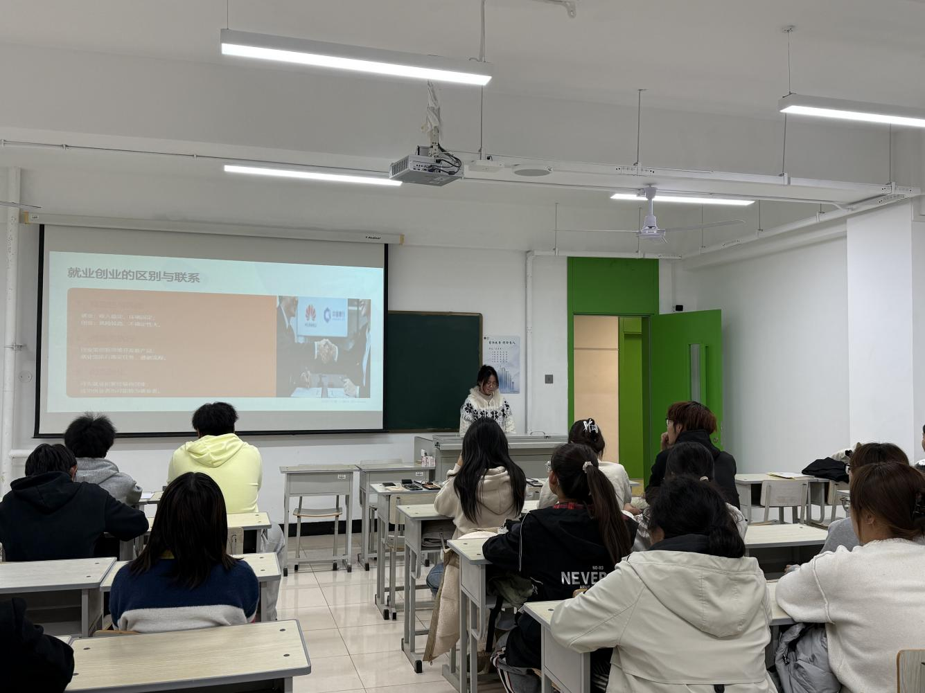 班会伊始,主持人聚焦就业与创业的区别与联系展开讲解。通过对比分析,为同学们解读了就业是加入现有企业获取稳定收入、遵循流程执行任务方式;而创业则是创建新企业追求收益、需以创新思维突破传统的过程,用通俗易懂的语言解释了两者的区别。同时也阐明了二者是可以相互转化的,在一定的时期通过特定的方式,就业和创业可以便捷的转换,为新生清晰的梳理了两种职业路径的核心差异与关联。