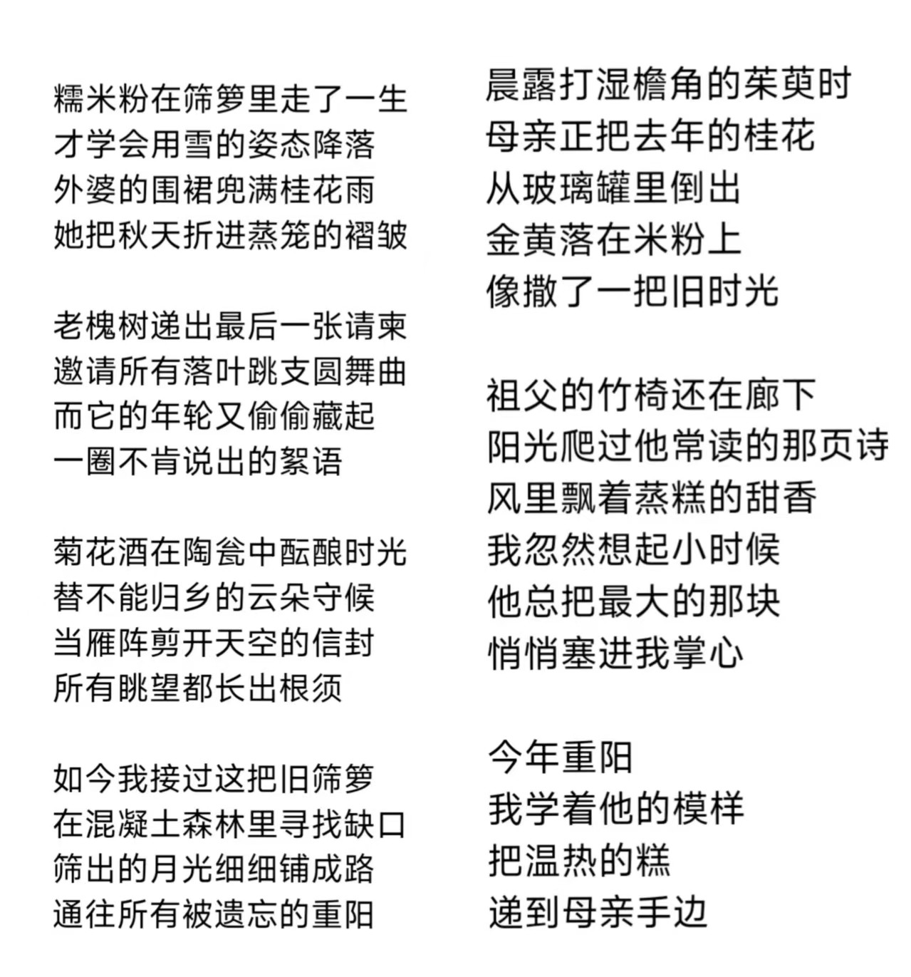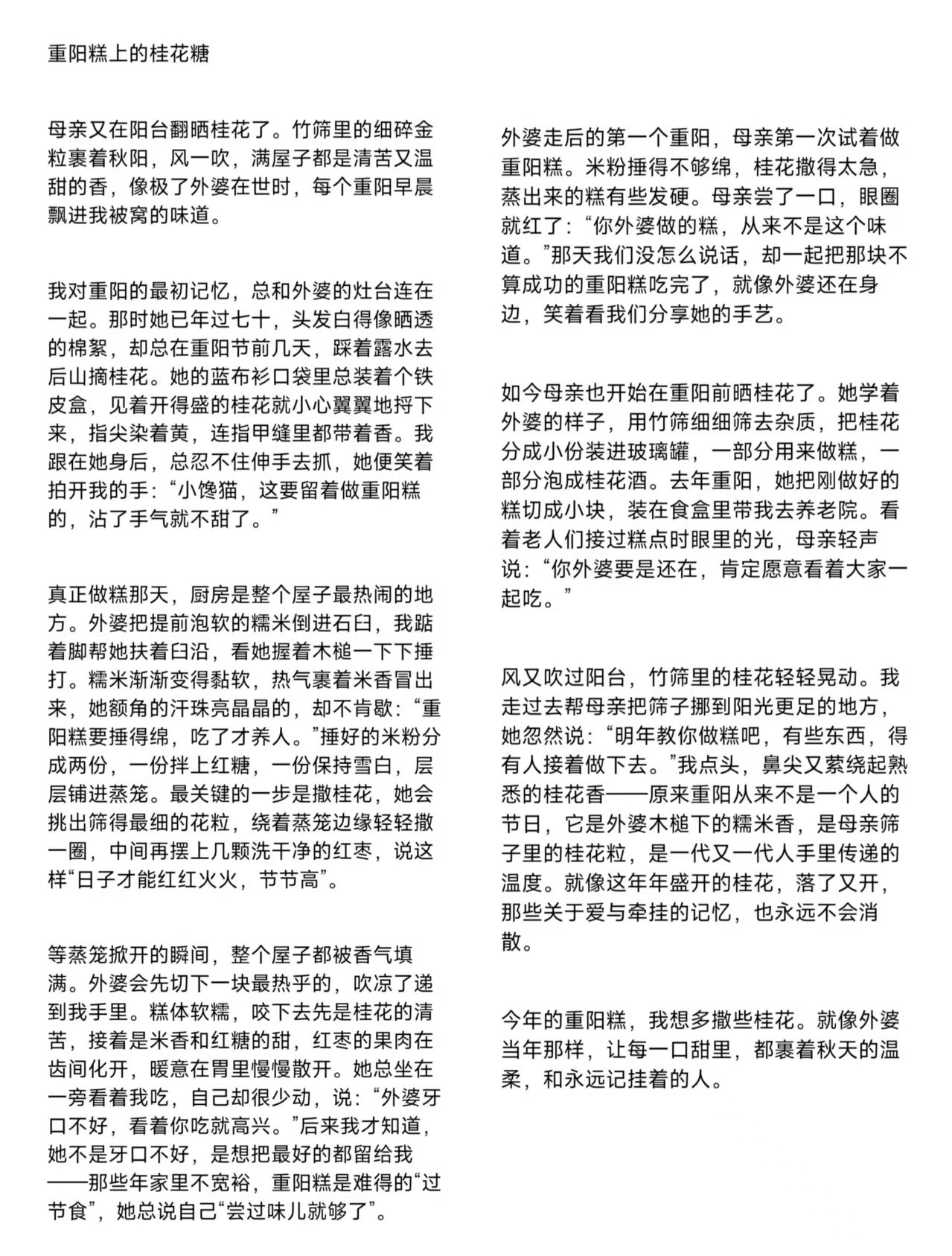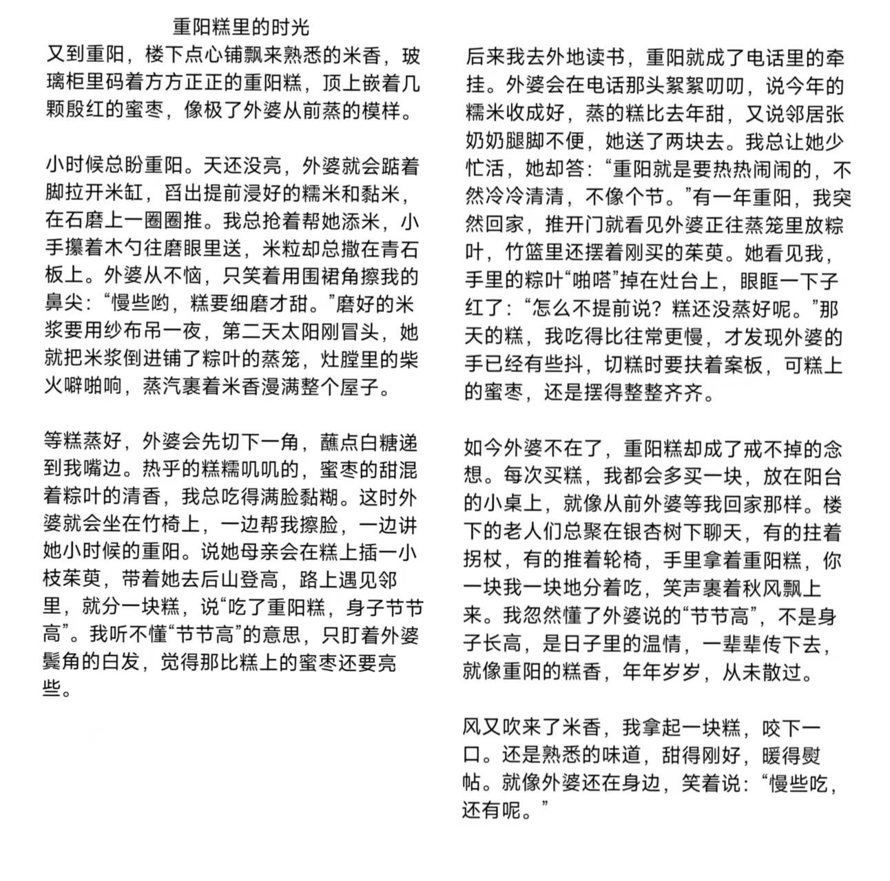 活动启动后,同学们积极参与,累计收到散文、诗歌、记叙文等参赛作品百余篇,每一篇作品都承载着同学们对长辈的牵挂与对节日的思考。大家将个人成长经历与重阳文化紧密结合,用真实故事传递情感。他们以家庭生活为切入点,讲述长辈在成长路上的陪伴与指引。部分学生还结合当下社会现状,思考如何在快节奏生活中给予长辈更多精神关怀,体现出当代青年对传统美德的践行与反思。