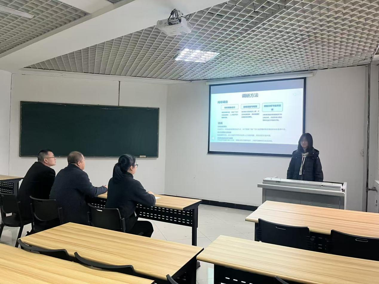 大赛伊始,参赛者首先介绍了自己对职业规划中“调研方法”这一内容的思考,他们采用PPT的方式对问卷调查、实地深度访谈、数据分析与总结等环节进行了阐述。三位评委认真聆听,整个会场尽显学术交流的认真与严谨。