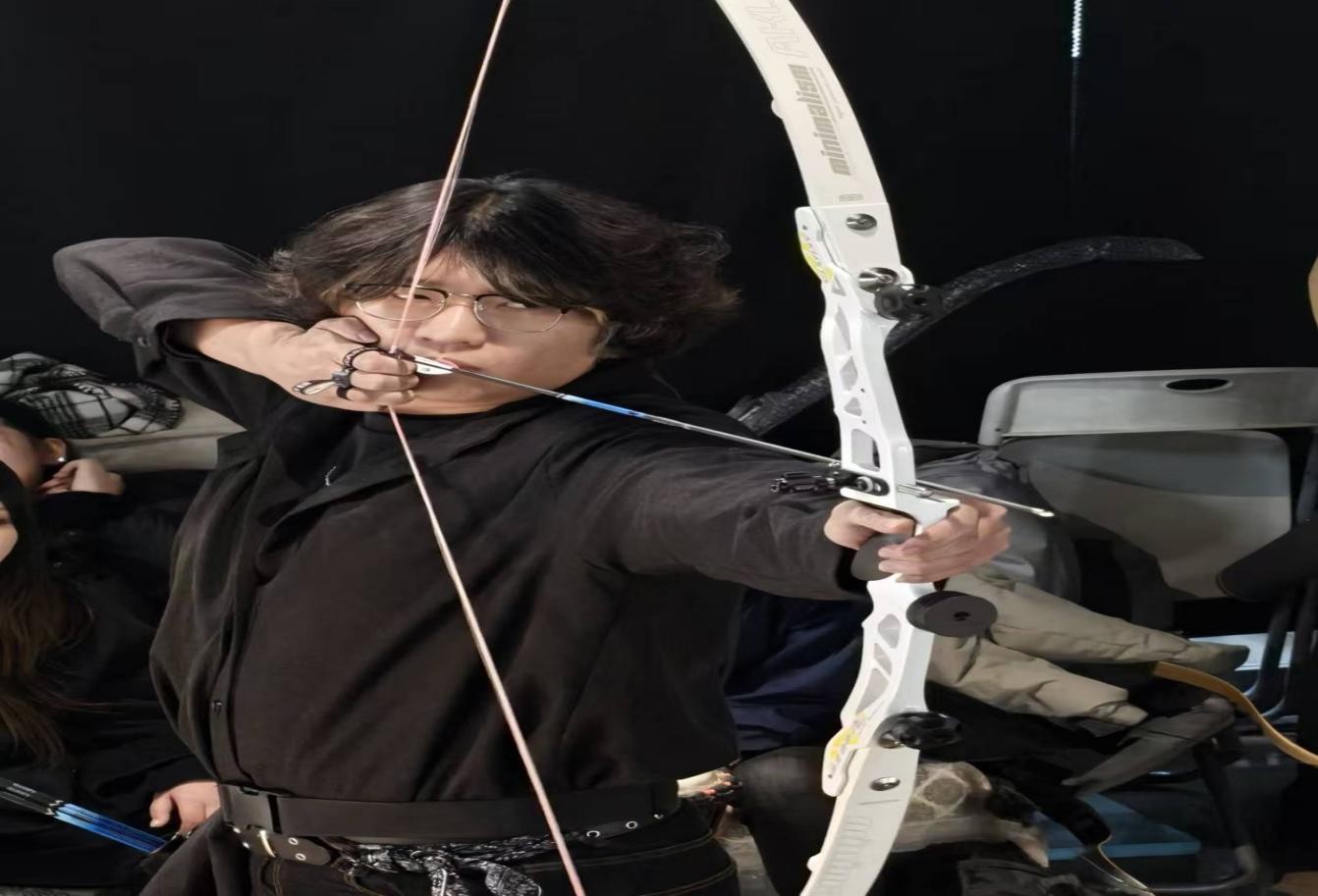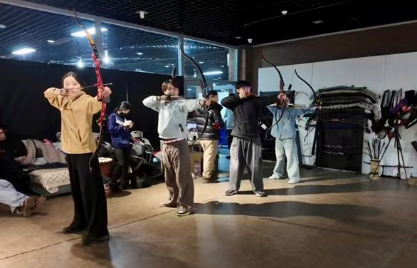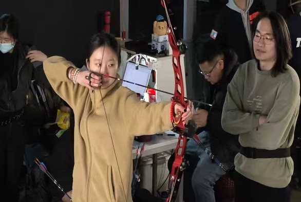 社员全神贯注拉弓瞄准