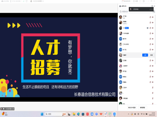 为了搭建校企沟通的桥梁,帮助学生拓宽就业渠道,找到合适的就业岗位。文化产业商学院于2025年3月28日举办了企业线上宣讲会。本次宣讲会是由学校岳武书记访企拓岗联系的企业——长春市道合信息技术有限公司,为全体学生进行了一次精彩的宣讲。
