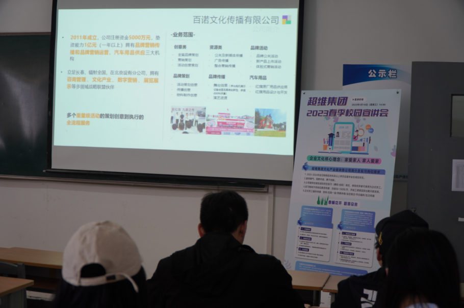 为进一步拓宽毕业生就业渠道,指导2023届毕业生顺利就业,文化产业商学院联合设计学院邀请校企合作单位长春维拖实业有限公司、长春高格铭瑞文化发展(集团)有限公司、长春吾未文化发展有限公司举办“企业进校园招聘双选会”。宣讲会于2023年5月10日下午两点在B528教室举行。文化产业商学院常务副院长韩国薇、院长助理刘宝雨、设计与产品学院院长助理李小为、文化产业商学院毕业班辅导员宋楚宁和企业的相关人员出席会议。