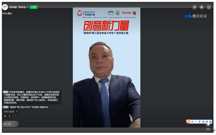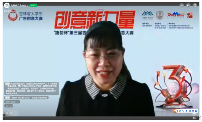 为进一步促进大学生的创造力、创新力以及创作能力,在吉林省教育厅的大力指导下,吉林省广告协会联合吉林动画学院,于11月30日下午开展“唐韵杯”第三届吉林省大学生广告创意大赛线上宣讲会。本次宣讲会的嘉宾有:吉林省广告协会会长刘丽、唐韵文化传媒总经理王文波、长春市青年力量文化科技有限公司总经理陶喆,吉林动画学院副校长王春丽,吉林动画学院文化产业商学院广告学系主任柳明老师,本次宣讲由吉林动画学院副校长王春丽主持,文化产业商学院全体学生参会。