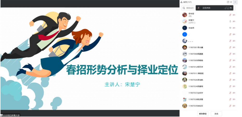 当前正值推进春招工作关键时期,宋楚宁老师结合往年就业数据与当前就业统计对今年的春招形势展开了详细分析。由于持续受疫情影响,用人单位的岗位需求仍待恢复,毕业生增量大、存量多,就业结构化矛盾突出,求职“内卷”严重。宋楚宁指出“毕业生的期望和市场的需求差距很大”,“慢就业”状态在大学生群体中普遍存在,每位同学必须引起高度重视。