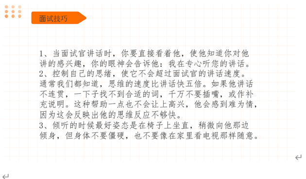 在会议中,辅导员宋楚宁老师用生动风趣的语言和鲜明的事例,围绕当代大学生的就业现状,择业方向,重点为同学们讲解面试时的注意事项,亲切的与同学进行多次互动交流,让同学们深刻领悟面试的要领,同学们积极参与,气氛相当热烈。