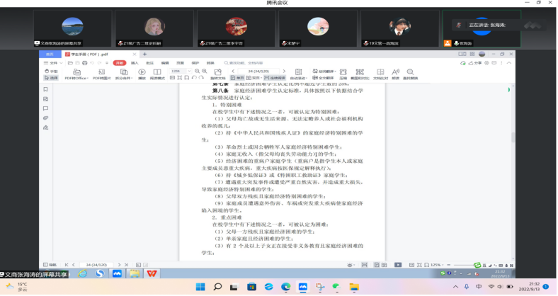 本次主题班会,由辅导员张海涛老师向班长们讲解了国家的资助政策、资助对象、资助标准以及资助申请流程、成立评议小组等内容,以便同学们可以根据自己的实际情况正确申请助学金,上报材料。