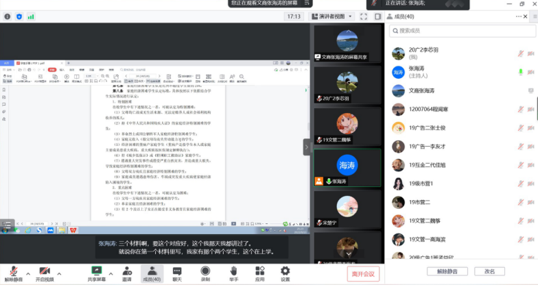 辅导员张海涛老师讲解完毕后,进入疑问解答环节,各位班委提前将同学们对于国家资助政策的疑问整合归纳后提问,辅导员张海涛老师逐一进行了详细的解答。整个班会中同学们快速高效,积极配合,开展得十分顺利。