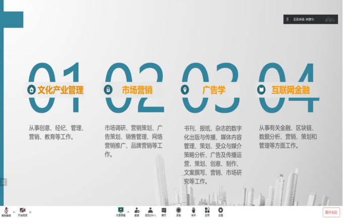 本次主题班会,辅导员宋楚宁老师针对文化产业商学院四个专业就业前景进行梳理,详细阐述了当前就业形势的严峻并对成因进行分析。对正在找工作的同学们给出充分建议,提前做好充足的准备。辅导员宋楚宁老师讲解完毕后,进入答疑解惑环节,同学们积极提问,宋楚宁老师为学生一一解答。