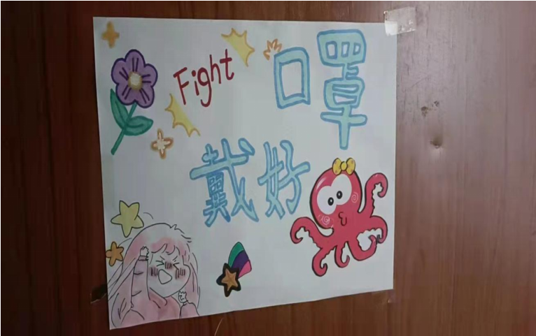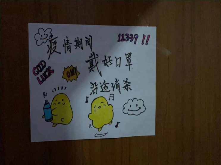每当经过一个宿舍,都能在门上看到温馨的防疫小提示,同学们有趣、精致的防疫字报大大提高了大家的疫情防控意识,为学校静态管理工作营造了有利的防疫氛围。小小的一张字报,体现了隔离在寝室的每一位同学都很认真的在对待疫情期间的各项静态管理防控措施,并严格按要求执行,不断提高安全警惕性,积极配合老师、志愿者们的日常防控工作。同时在课余时间,利用现有资源合理丰富宿舍生活,积极学习专业文化知识,共同营造造良好的宿舍文化与整洁、美观的生活、学习环境。