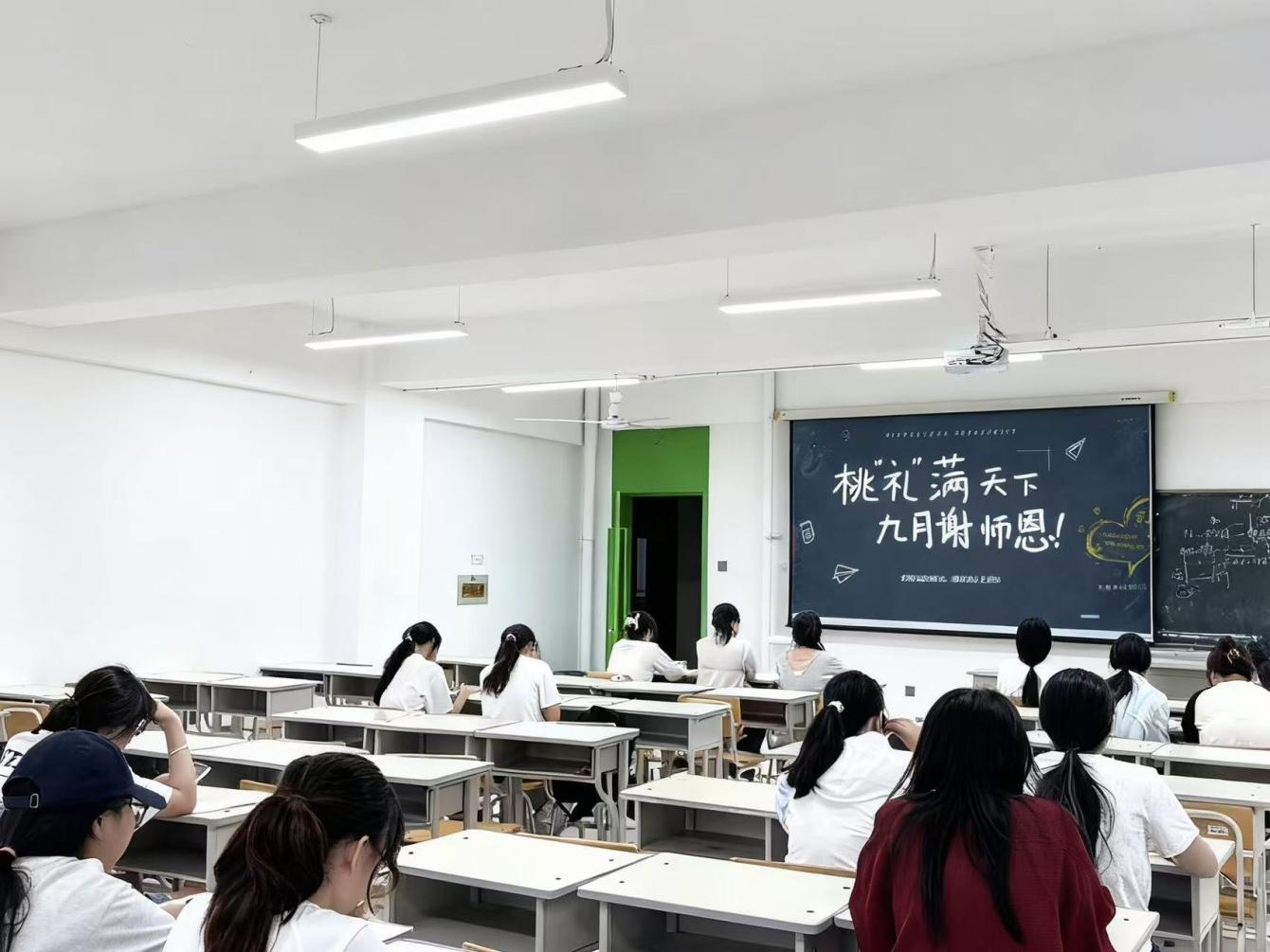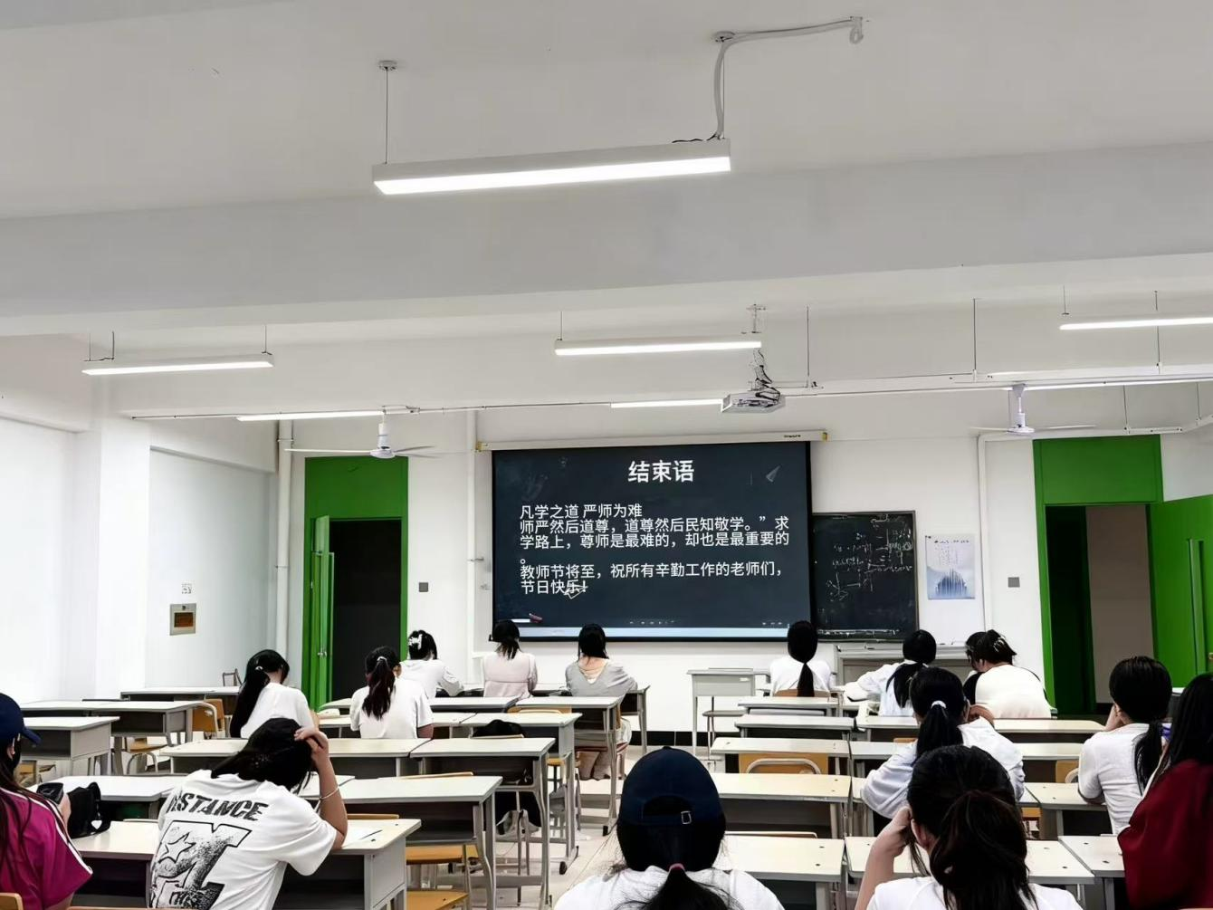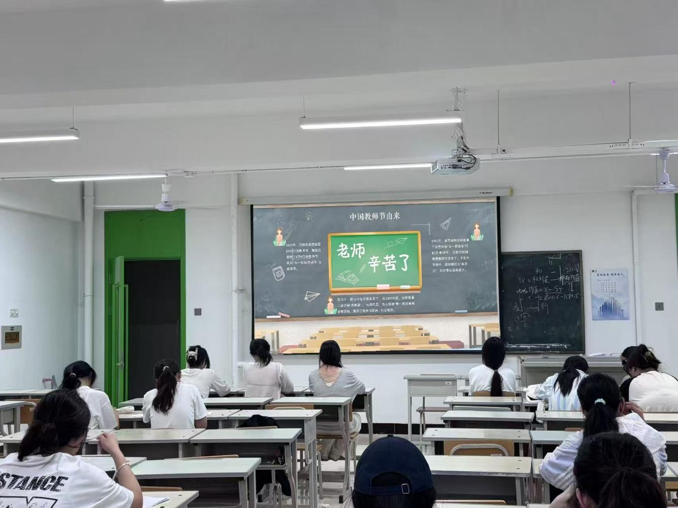 随后,赵睿姝围绕教师节的历史渊源与时代意义展开分享。她从古代“释奠礼”对教师的尊崇,讲到现代教师节设立的初心;从“三尺讲台系国运,一生秉烛铸民魂”的使命担当,谈到了身边教师立足岗位、默默付出的鲜活事例。同时,她还引导同学们结合自身经历,分享与老师之间的温暖故事,现场氛围温馨而浓烈。