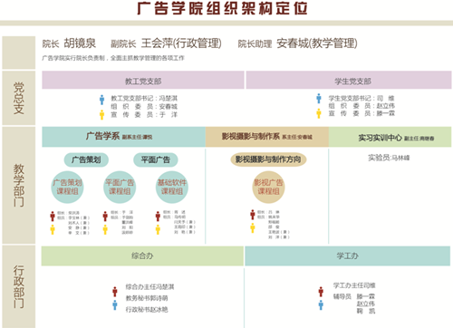 按《吉林动画学院全面深化二级管理实施方案》的工作要求,结合高等教育规律、现代大学理念和企业目标管理方法,广告学院确定建设发展定位,梳理工作体系职能职责,通过清晰的工作流程、明确的工作标准,制定专项工作管理评价体系,提升管理水平及工作执行力,达到全面深化学院二级管理建设的要求。