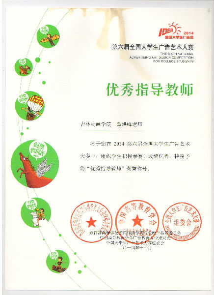 广告学院董洪峰老师获此届大广赛优秀指导教师。他指导的学生作品中,11级学生杜海峰、陈家伟创意作品《冰力克》获大赛平面类作品一等奖,11级学生丁郁创意作品《999感冒灵》、刘仲毅创意作品《百度云音乐》获大赛“平面类”作品三等奖,获大广赛优秀奖学生作品十件。董洪峰老师及获奖学生代表受邀参加了在北京举行的颁奖典礼。