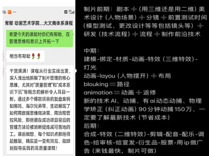 科学完善的课程体系实现理论与实践并重。"大文商"管理工作室以数字文化产业需求为导向,构建了特色鲜明的课程体系。首期课程涵盖动画、漫画、电影、游戏四大专业领域,内容包含项目创作流程、项目管理、市场调研与策划、企业管理、品牌传播、运营推广等核心模块。通过产业导师与文商学院教师的联合授课,学生将在理论与实践的双重淬炼中,全面提升跨学科协作能力、综合策划能力与实战操作能力,为未来职业发展奠定坚实基。