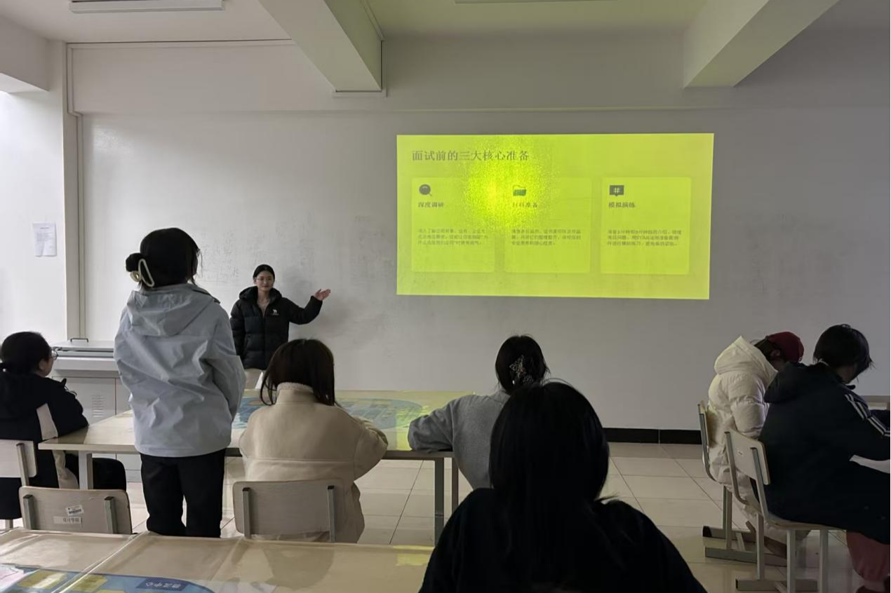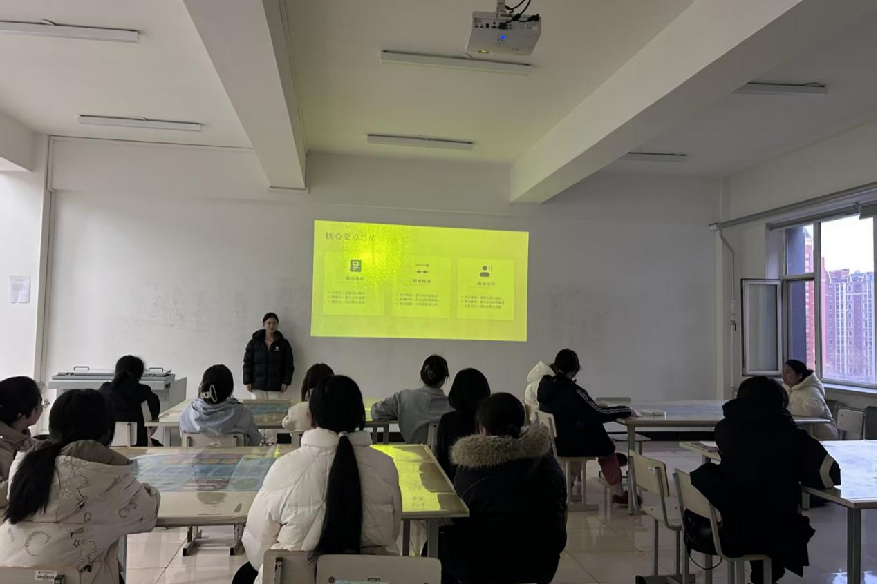 分享会伊始,宋宜航同学结合当下行业招聘趋势,从投递现状剖析、多元投递渠道详解、实操细节点拨等方面展开分享,重点围绕简历优化、精准投递、面试技巧三大核心模块进行系统梳理,并现场示范操作流程,帮助同学们扫清求职投递盲区,掌握实用求职技巧。
